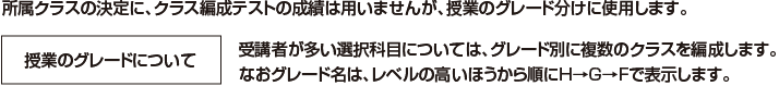 申し込み時に選択したコースの中で、どのクラスに所属するかについては、4/7・8に実施するクラス編成テストの英語・数学・国語の成績によって決定します。これらの教科については、所属クラス単位で授業を行うので、自分の学力に合ったクラスで、効果的に学力をつけることができるようにしています。それ以外の選択教科(理科・地歴・公民・情報)については、それぞれ成績に応じたグレードのクラスで授業を行います。なお、クラス編成テストは、来年度入試に必要な教科・科目をすべて受験してください。