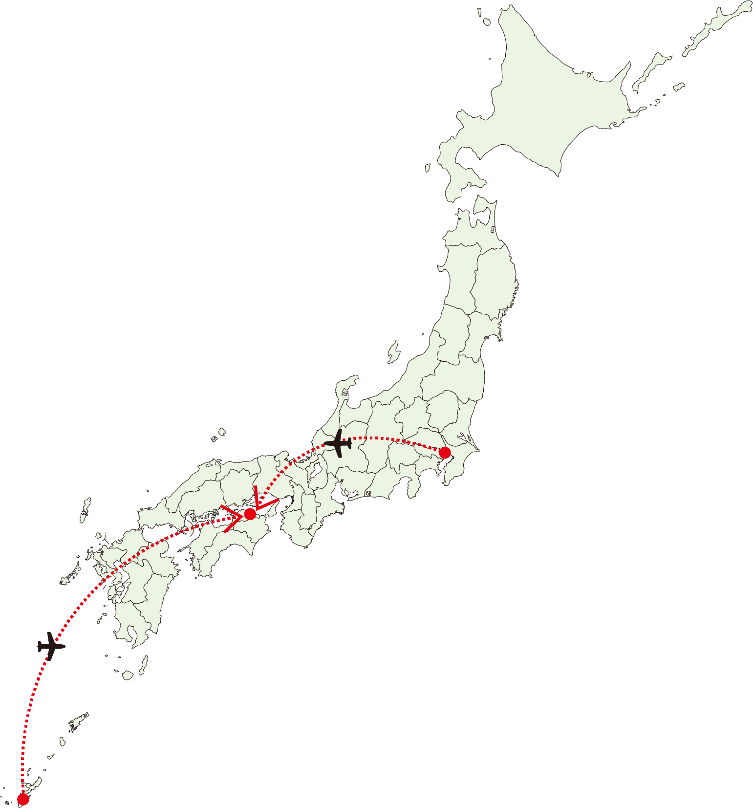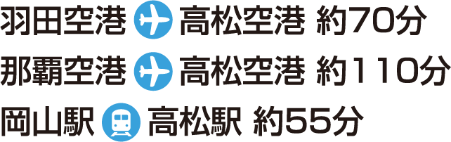 香川県高松市は各地からのアクセスが良好です。東京からの飛行機の便数も多く、岡山からならJR快速マリンライナーで1本。関西圏からは神戸・鳴門ルート経由の高速バスで簡単に往来できます。