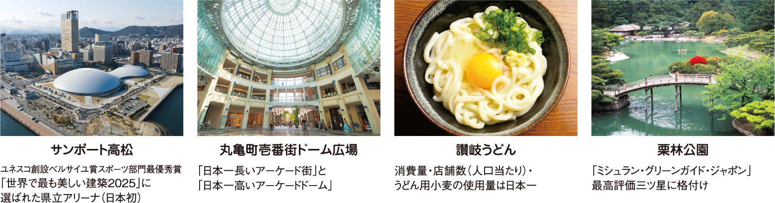 「日本一小さな香川県の県都である高松市は、人口約41万人の中核市です。古くから四国の玄関口として国の出先機関や企業の支店が集積し、優れた都市機能が備わっています。 気候は温暖で晴れの日が多く、地震や台風などの災害が少ないことが特徴です。フラットな地形で道路網の整備水準が高いため、多くの人が通学・通勤に自転車を利用しています。レンタサイクルを利用してのうどん店巡り、日本一長いアーケード商店街でのショッピングなども観光客の人気となっています。